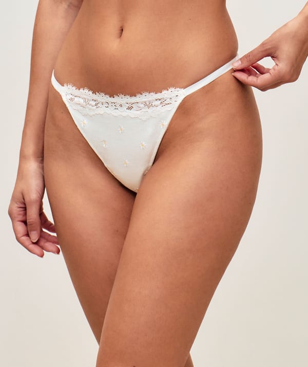• Tanga de jersey con encaje y bordados florales;